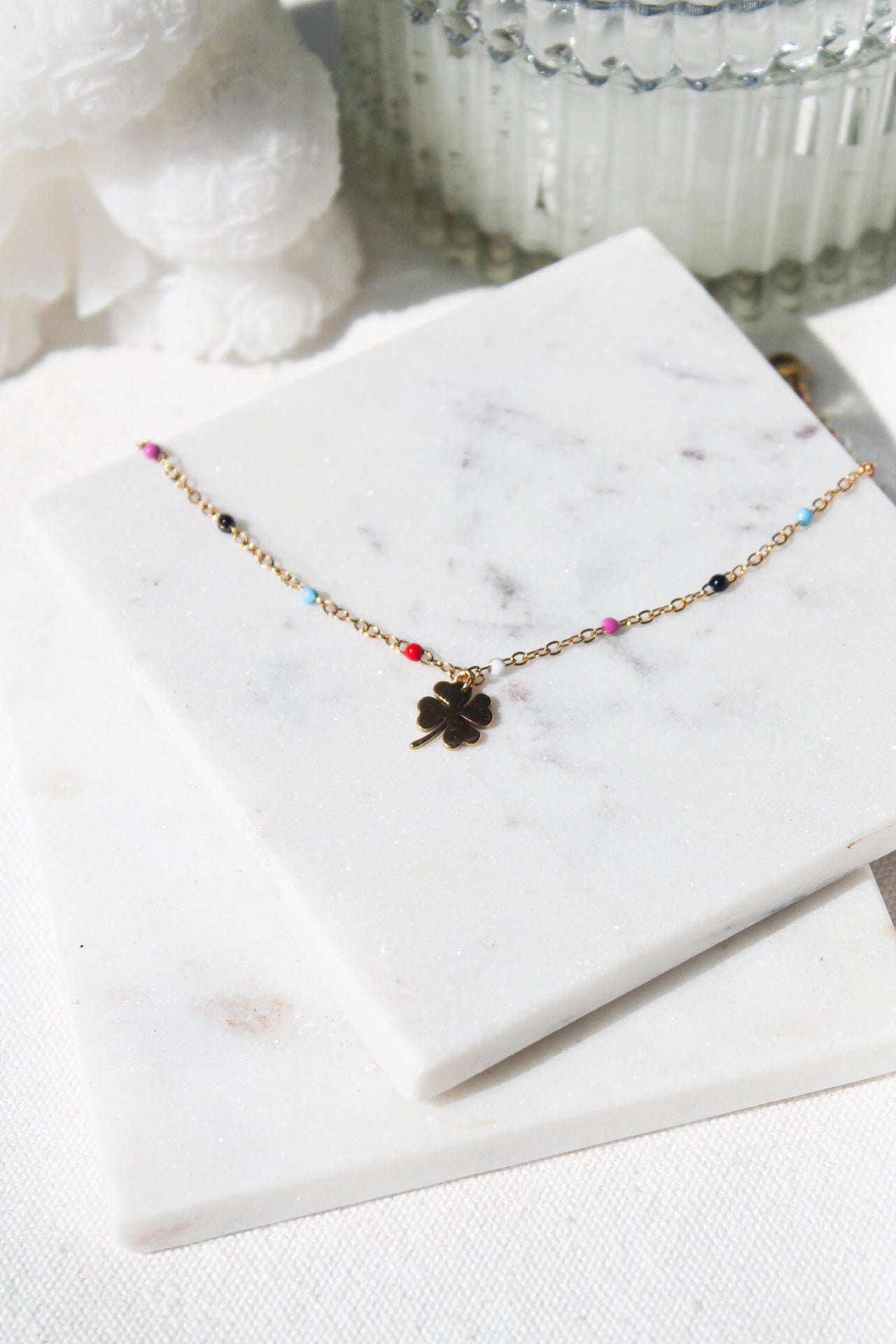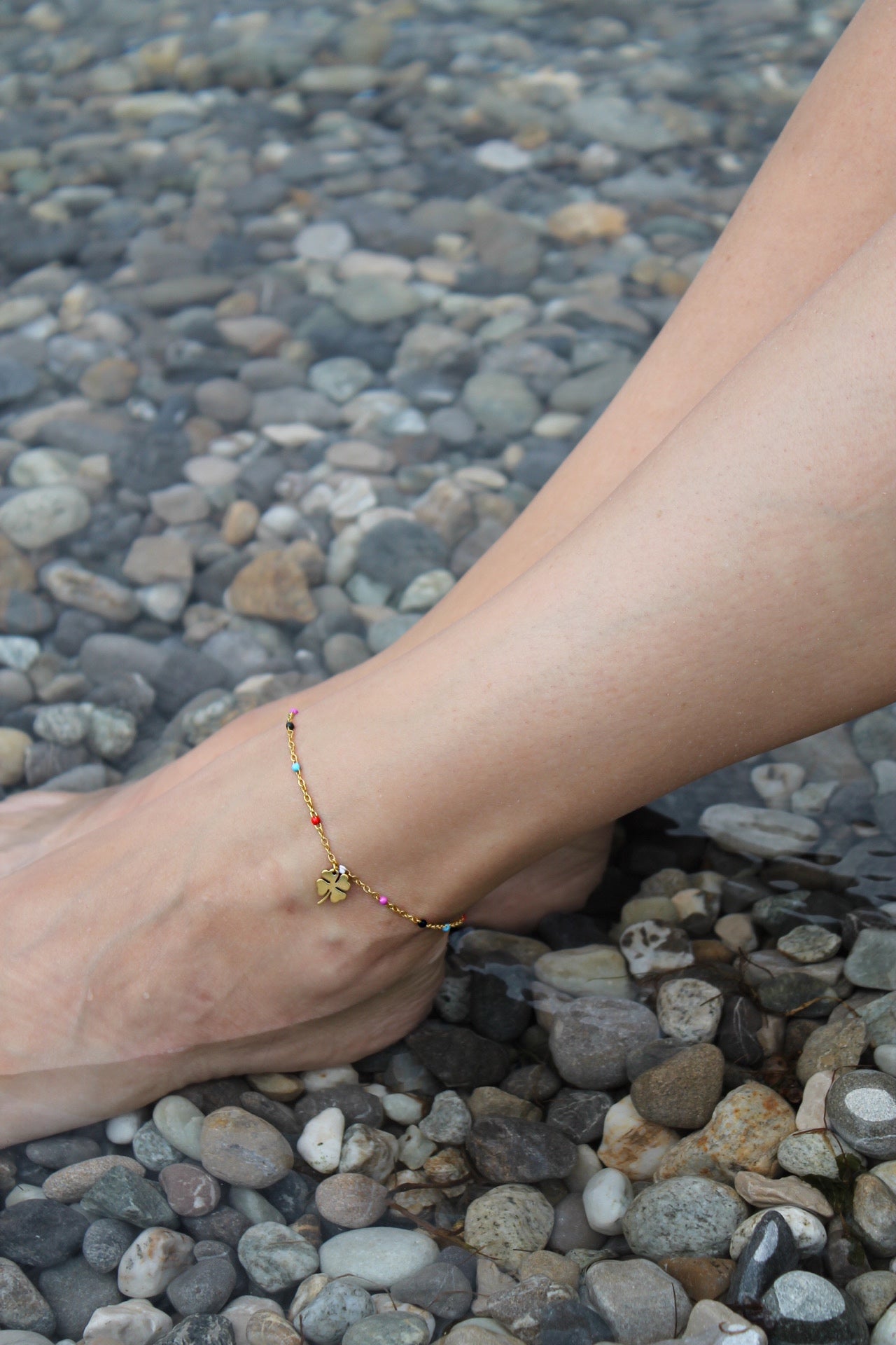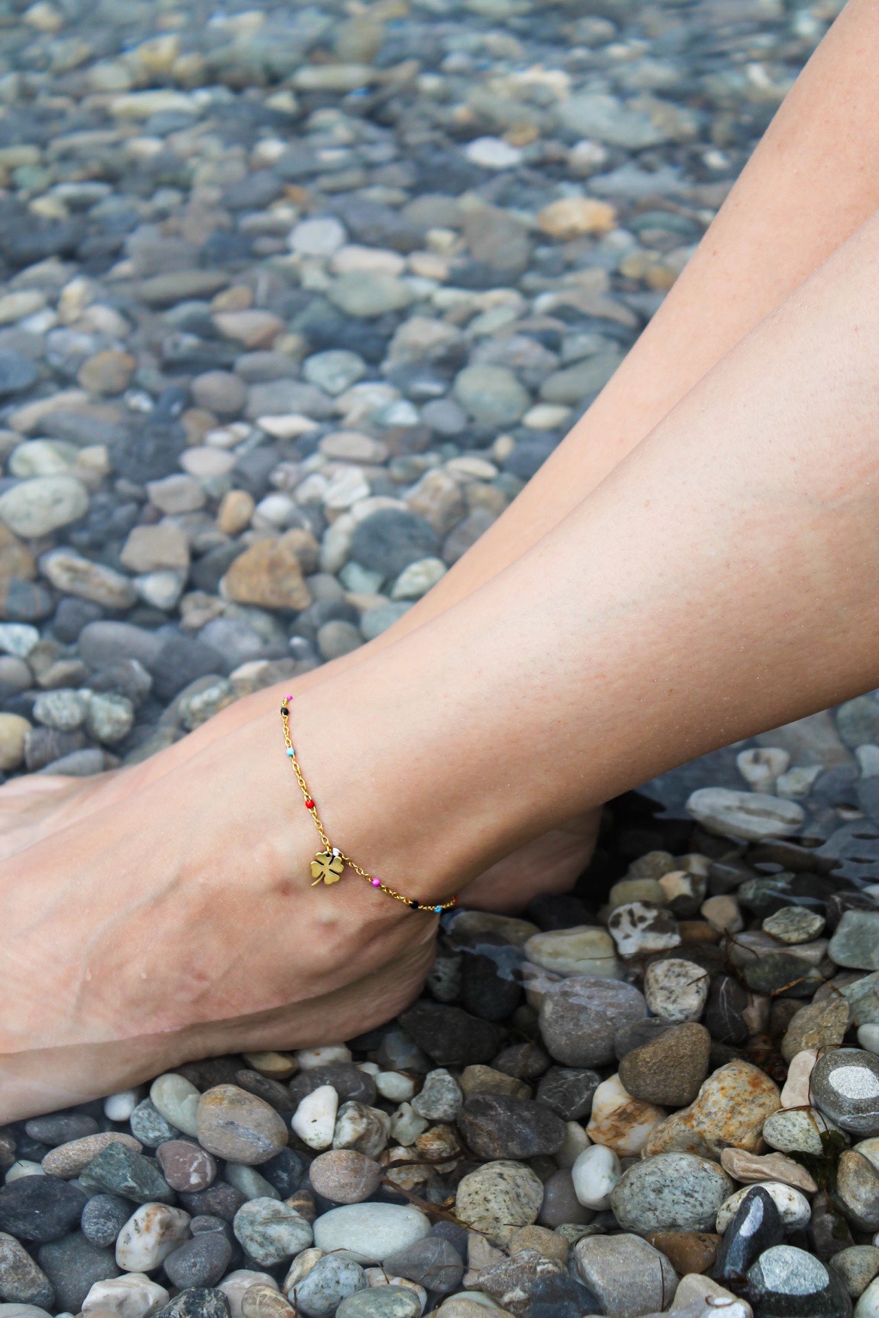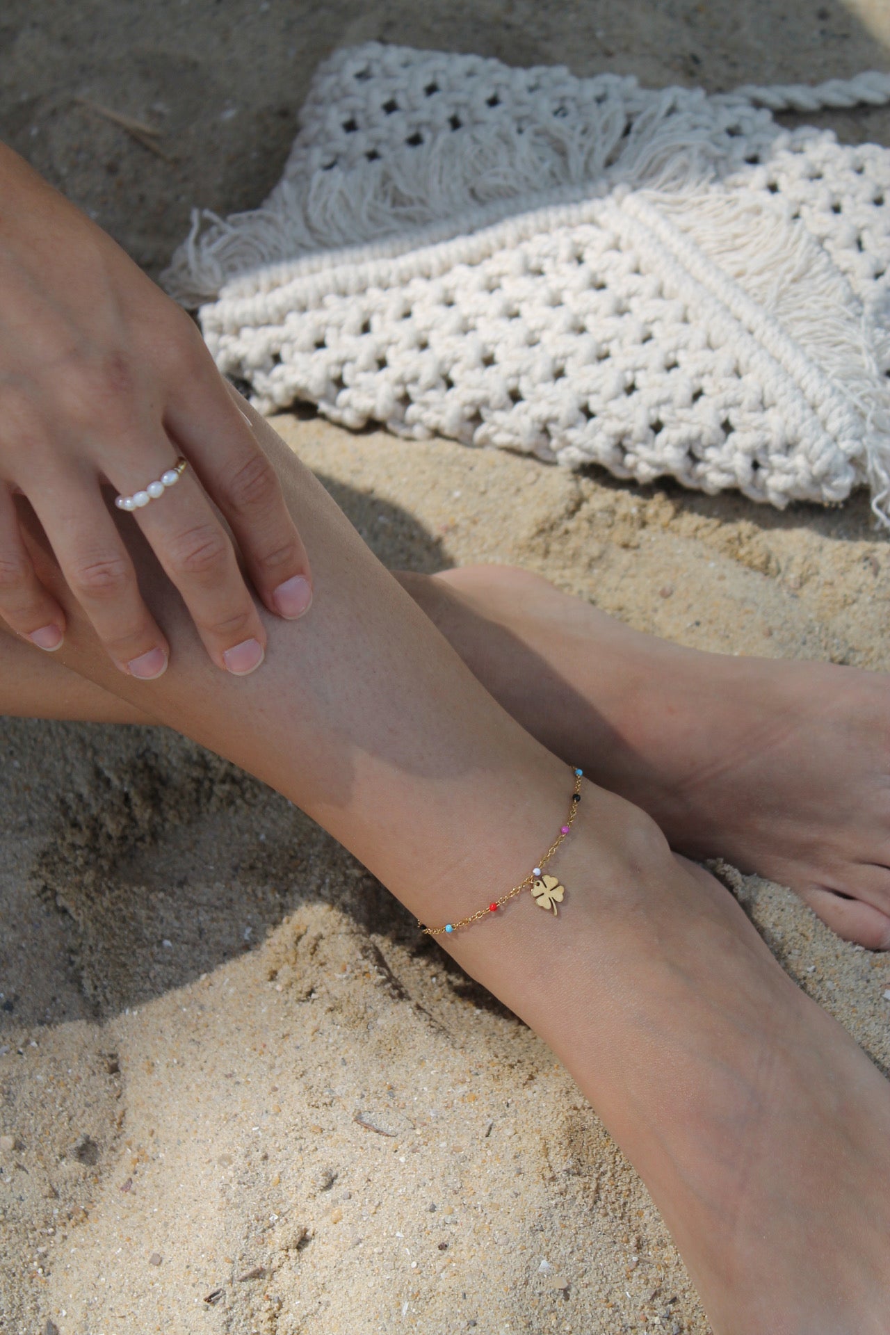 Découvrez la joie des journées d'été avec notre bracelet de cheville vibrant, doté d'un charmant motif de trèfle. Ce bijou coloré et ludique est parfait pour ajouter une touche de fun à votre look estival. Minori deviendra votre accessoire incontournable pour les journées chaudes. Embrassez la saison avec style, grâce et un peu de chance de votre côté !