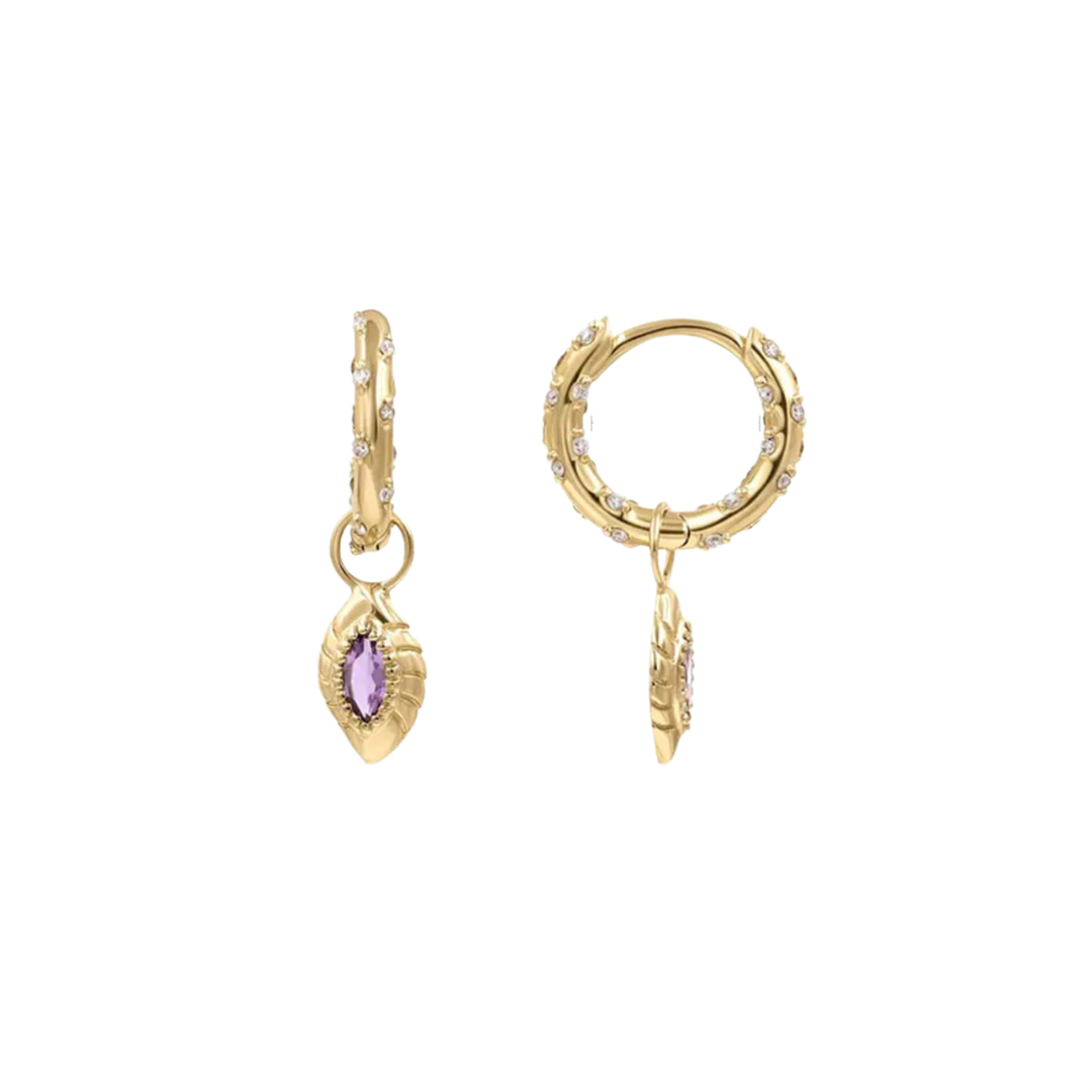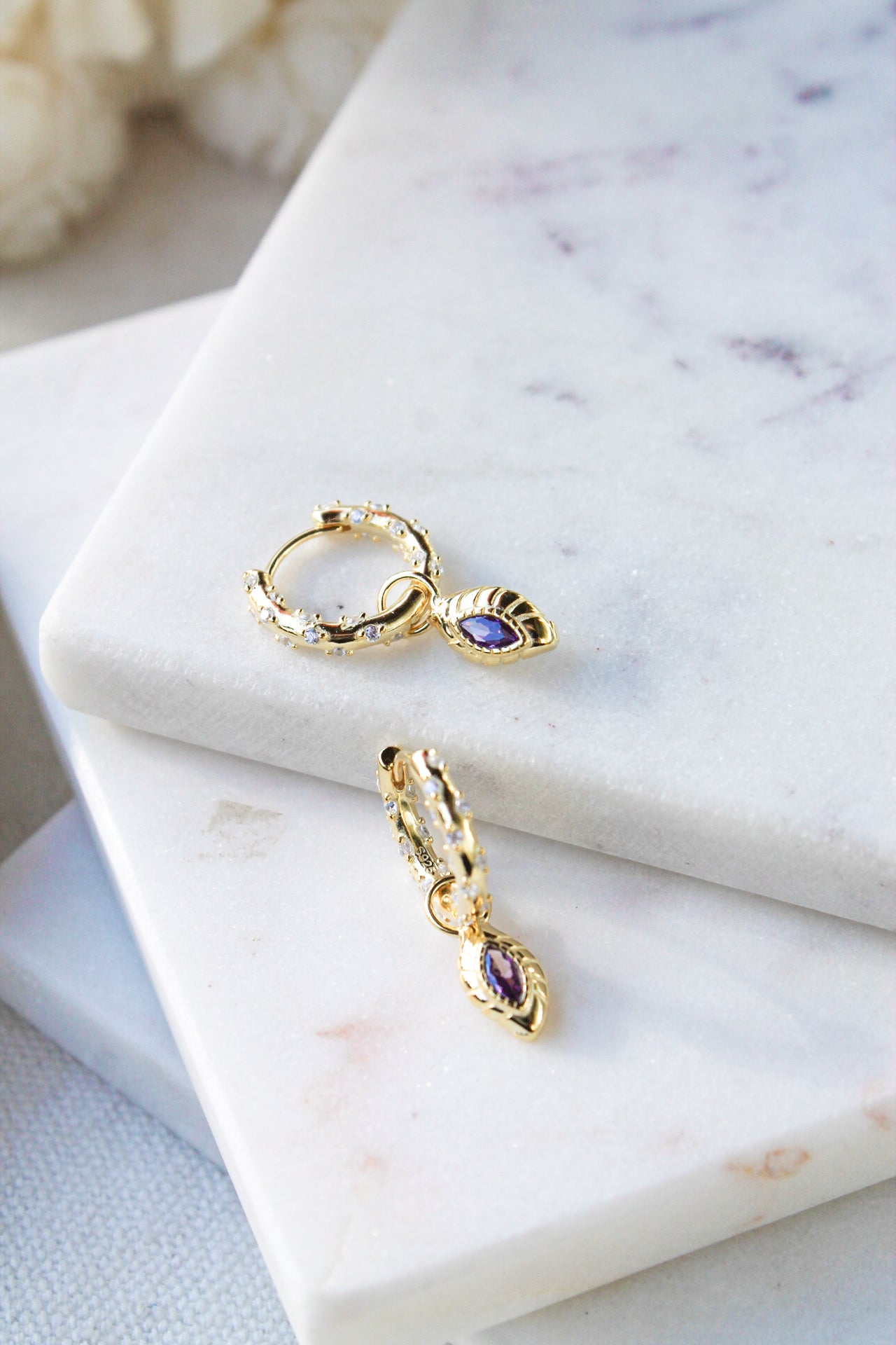 The Noëlle Earrings are a playful and elegant 2-in-1 design featuring minimalist gold huggies with a detachable purple charm. Style them with the charm for a bolder, colorful look — or wear them solo as sleek everyday hoops.