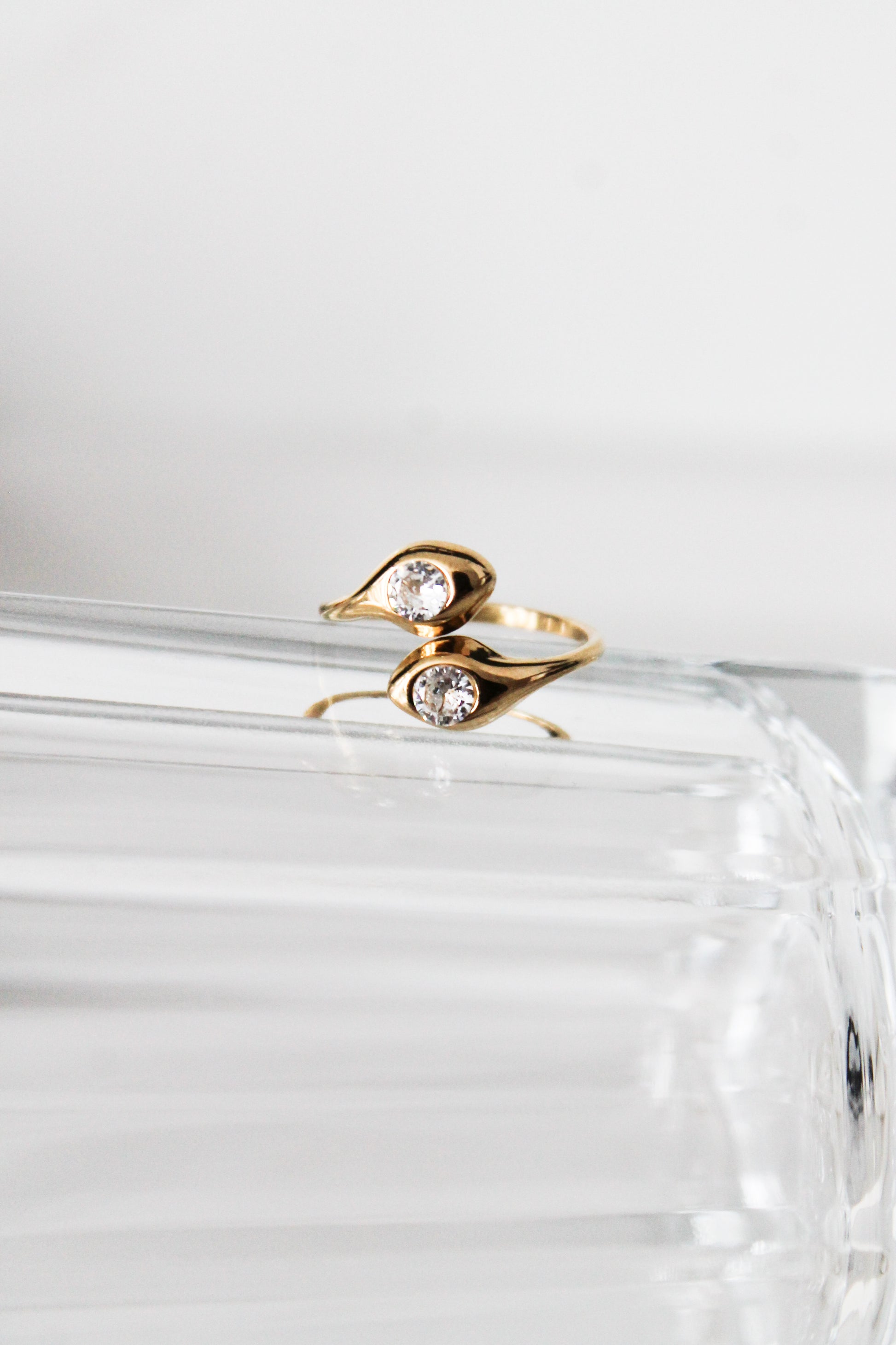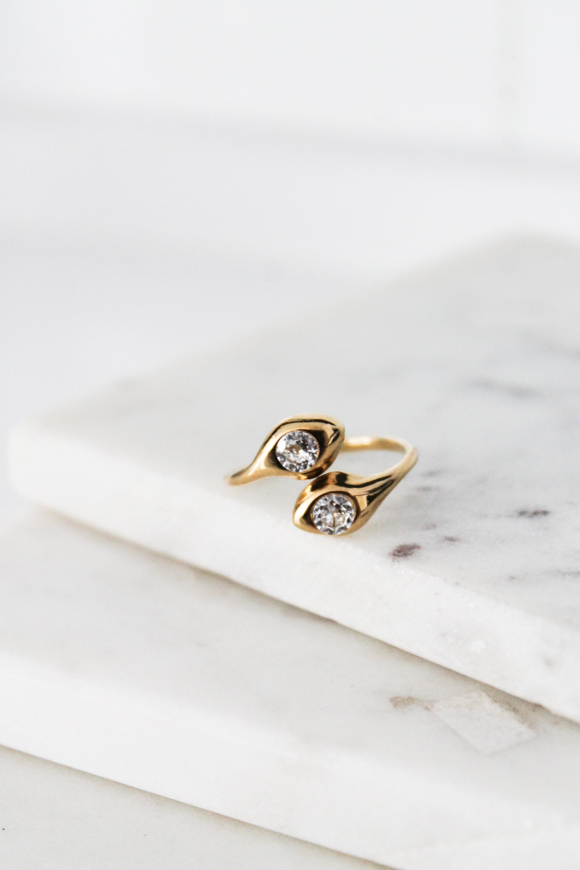 Meet The Carrie Curve — a statement ring crafted for bold elegance. This open-style ring features a sleek, curved gold band punctuated by two striking bezel-set gemstones on each end. Its asymmetrical silhouette adds an architectural edge while maintaining a soft femininity.