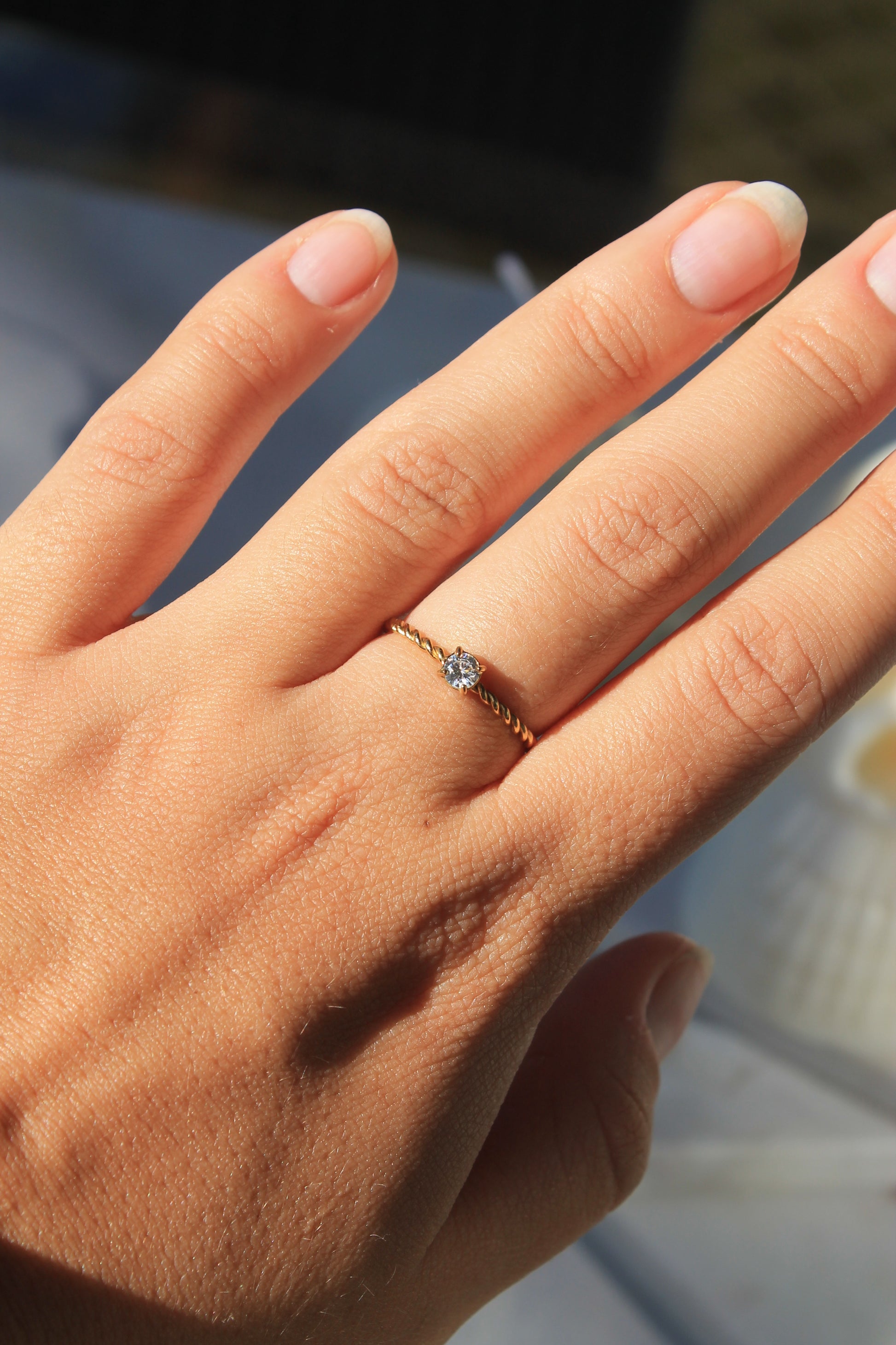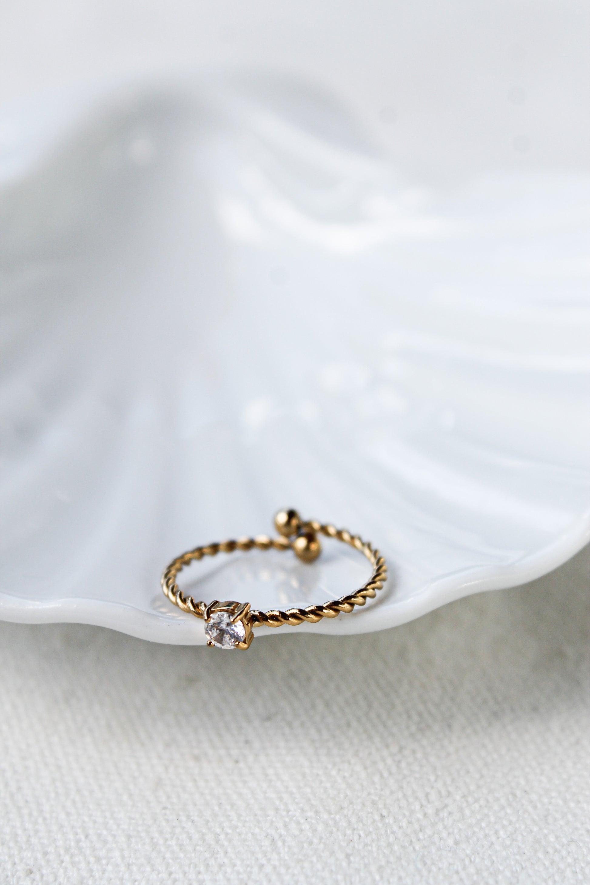Twisted rope ring with a small zircon in the middle.If you like minimalistic jewelry this ring will become your new bestie. Wear it every day and enjoy this look. Clair is adjustable but fits mostly size 7 8 & 9. it won’t fit size 6 or 5.