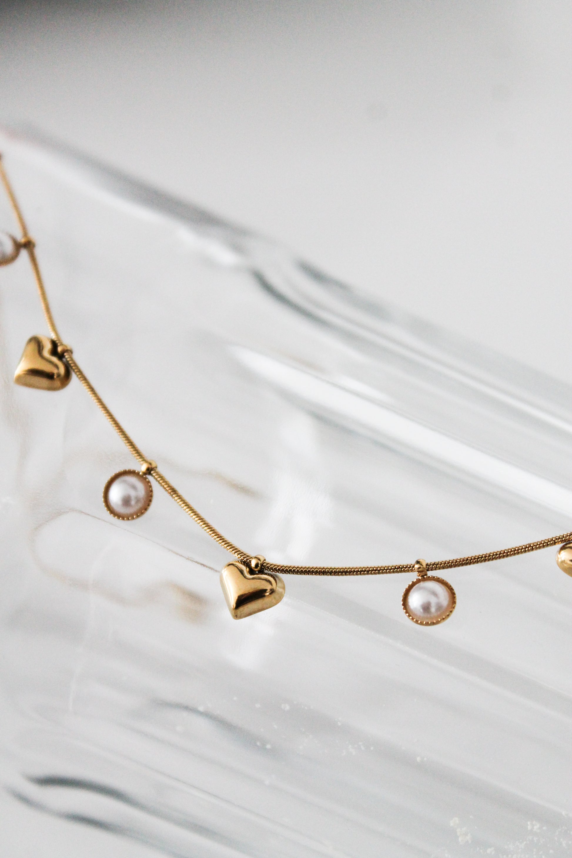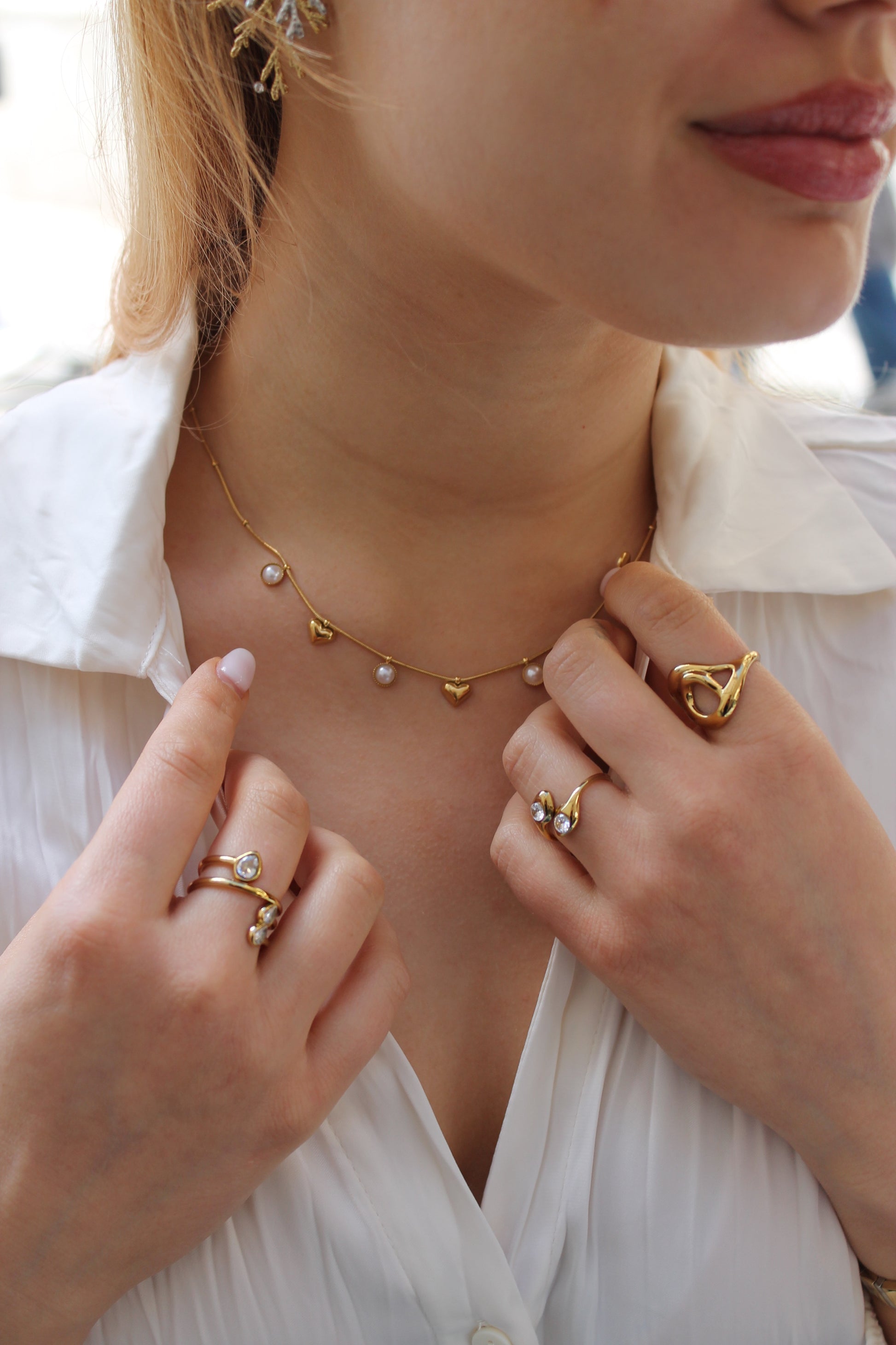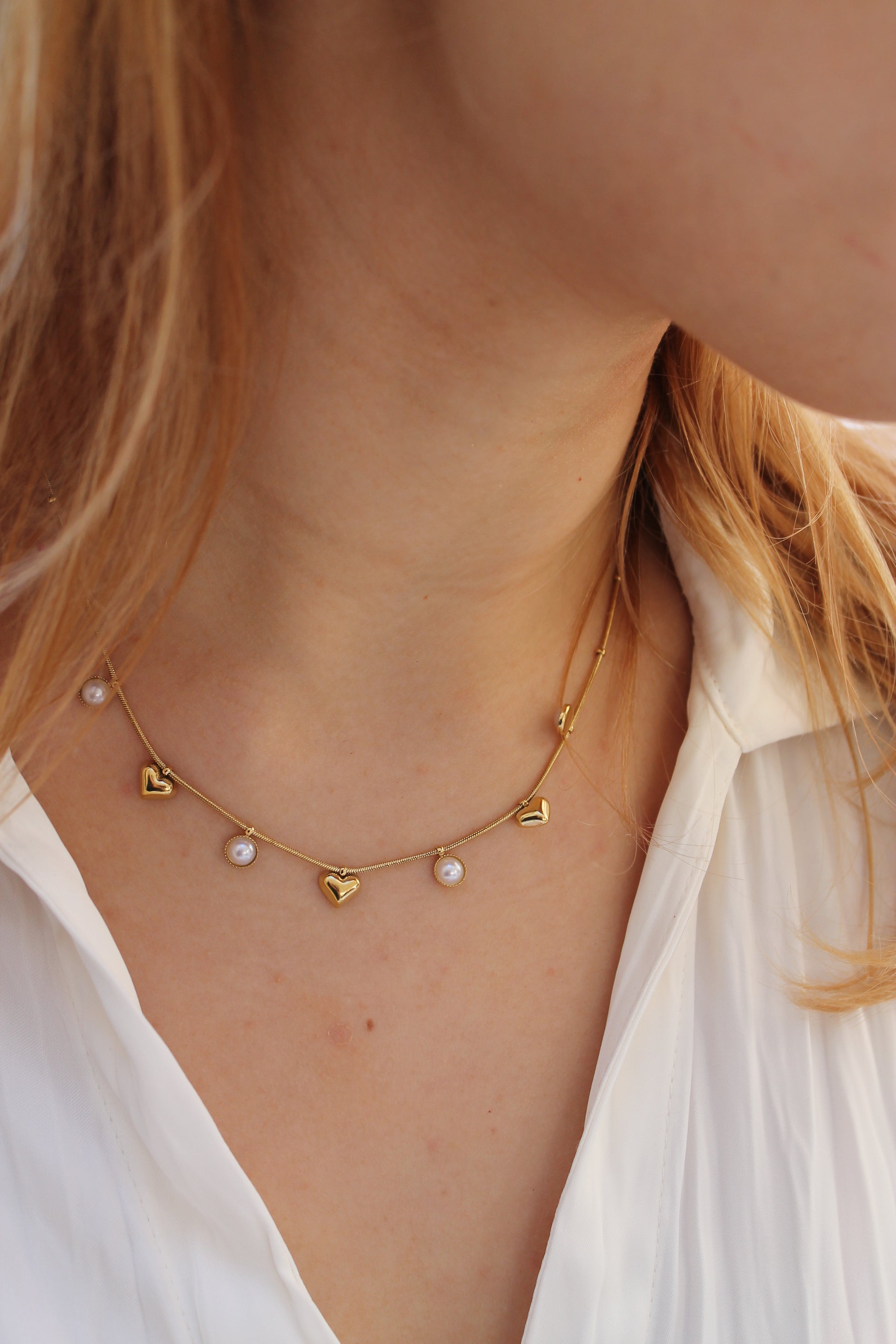 Playful and chic, The Fifth Date Necklace is the kind of necklace you’d throw on before a SoHo coffee run — and still be wearing for rooftop drinks hours later. Featuring golden puffy hearts and pearl-like charms strung on a sleek gold chain, it captures that flirtatious, city-girl ease.