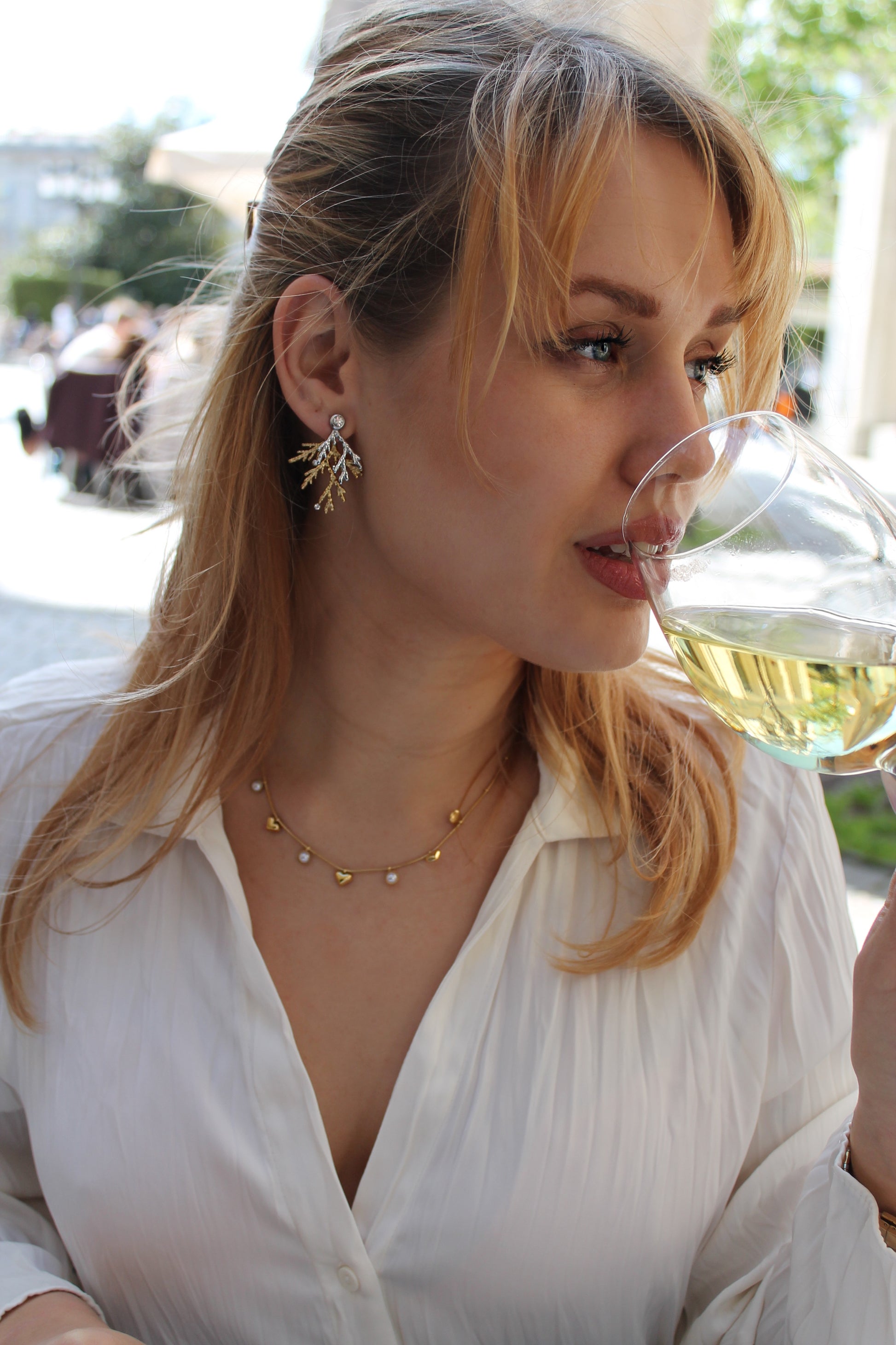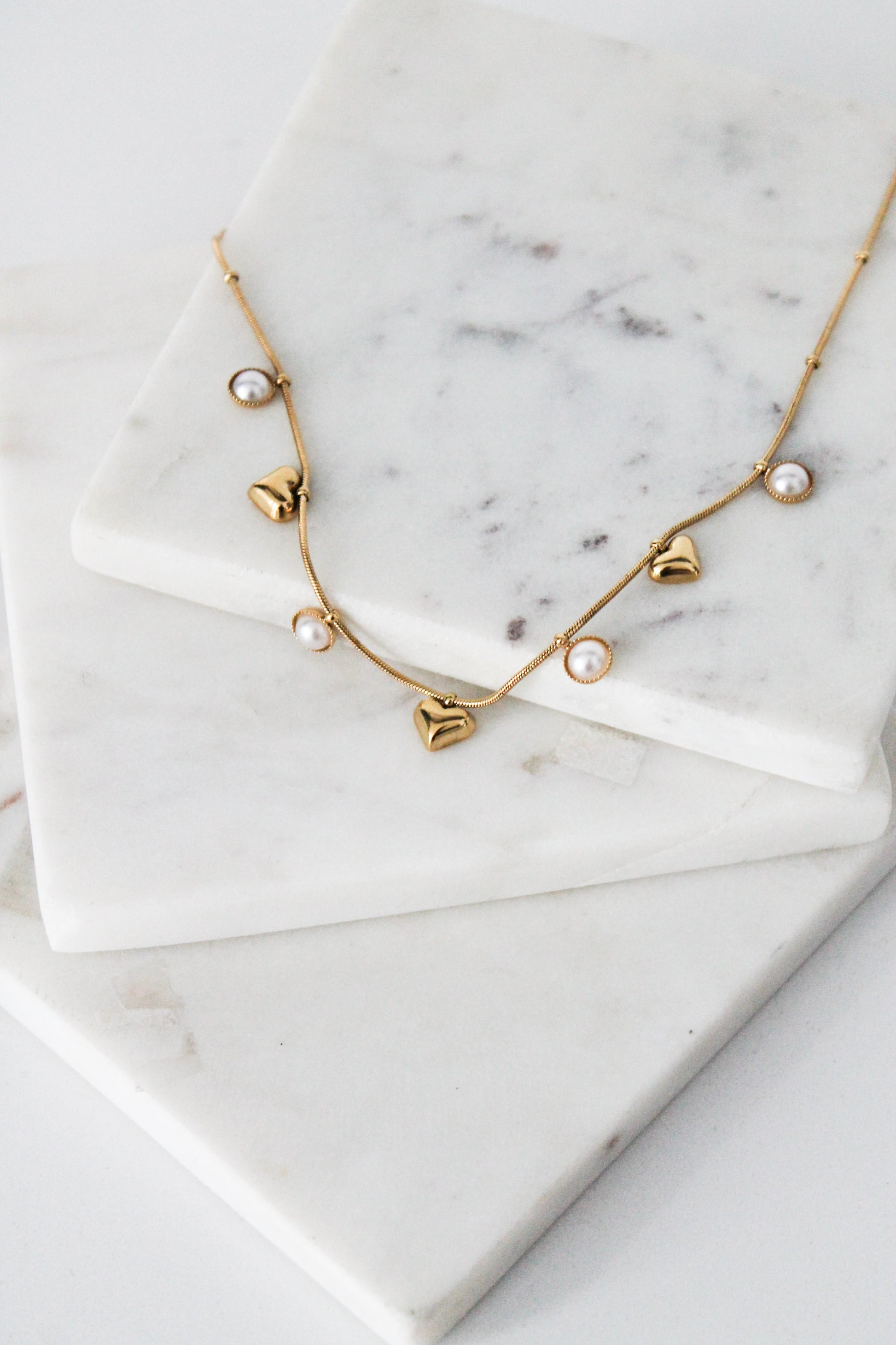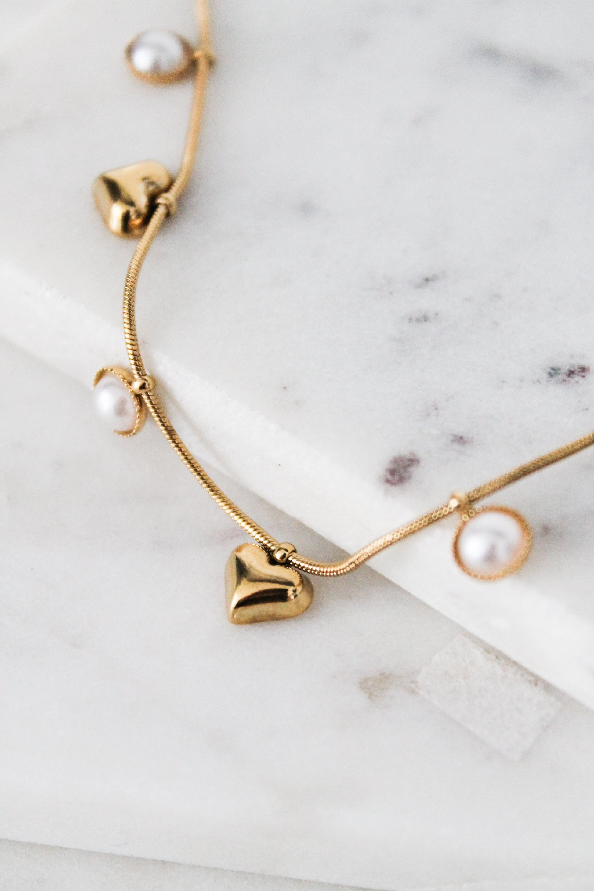 Playful and chic, The Fifth Date Necklace is the kind of necklace you’d throw on before a SoHo coffee run — and still be wearing for rooftop drinks hours later. Featuring golden puffy hearts and pearl-like charms strung on a sleek gold chain, it captures that flirtatious, city-girl ease.