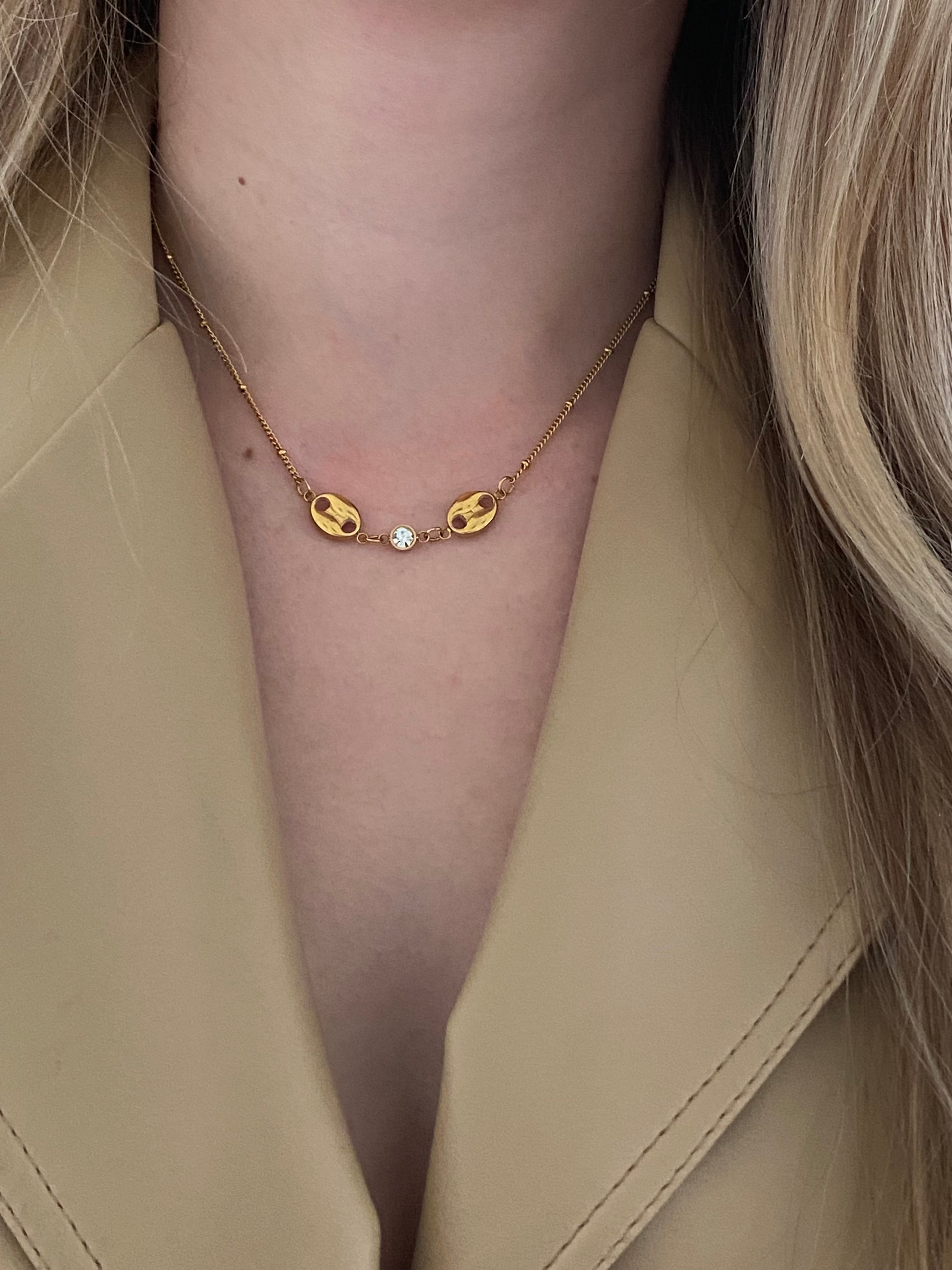 Minimal effort, maximum impact. The Golden Hour Necklace brings bold elegance to your neckline with its two molten oval charms — each with soft, sculpted curves and a modern, open design that mimics flowing metal. Nestled between them: a high-shine crystal, catching the light like the last rays of sun on a summer evening.