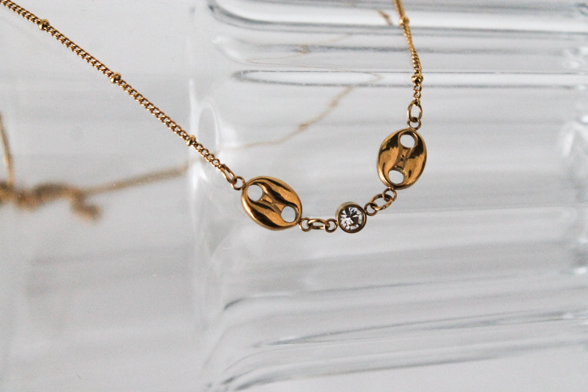 Crafted in warm gold-tone finish with a delicate beaded chain, it’s lightweight, glossy, and made to glow. Wear it solo for understated glam, or stack it with layers for your main character energy. The perfect piece for spontaneous nights out or quiet brunches with your best girls.