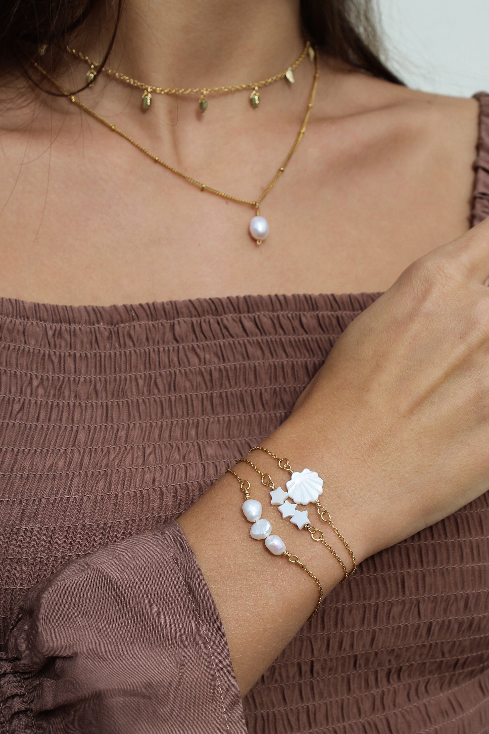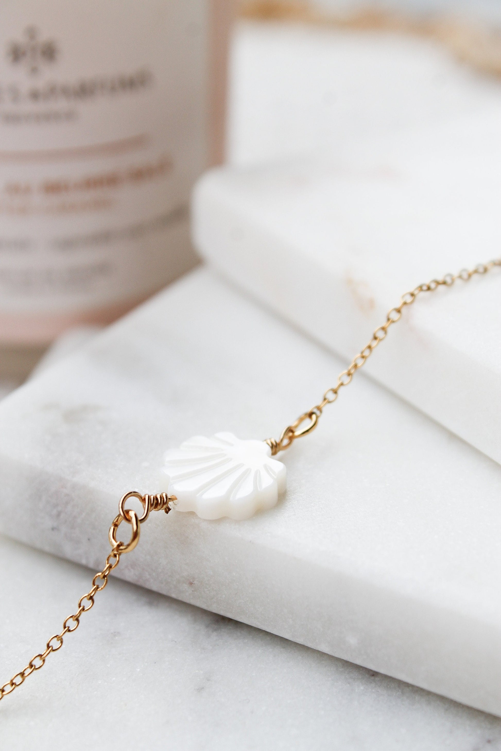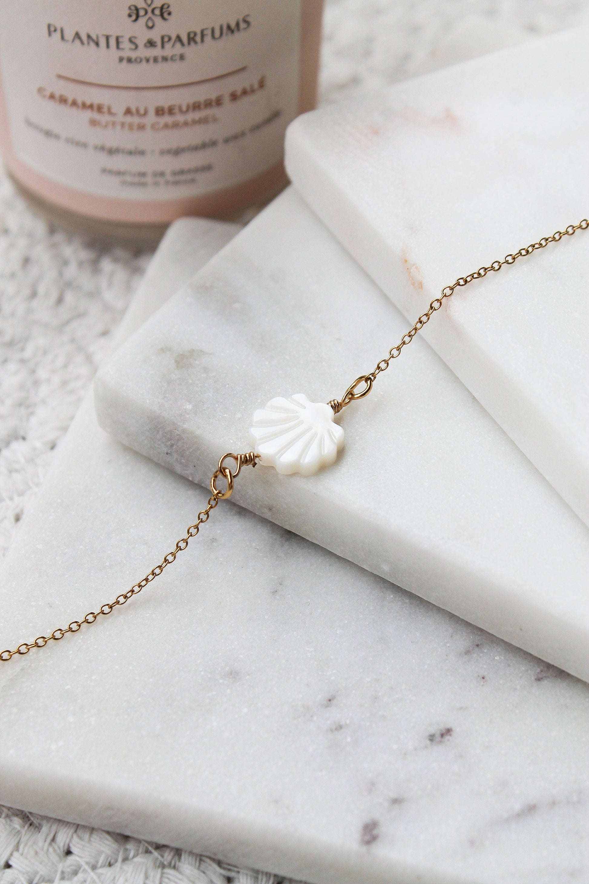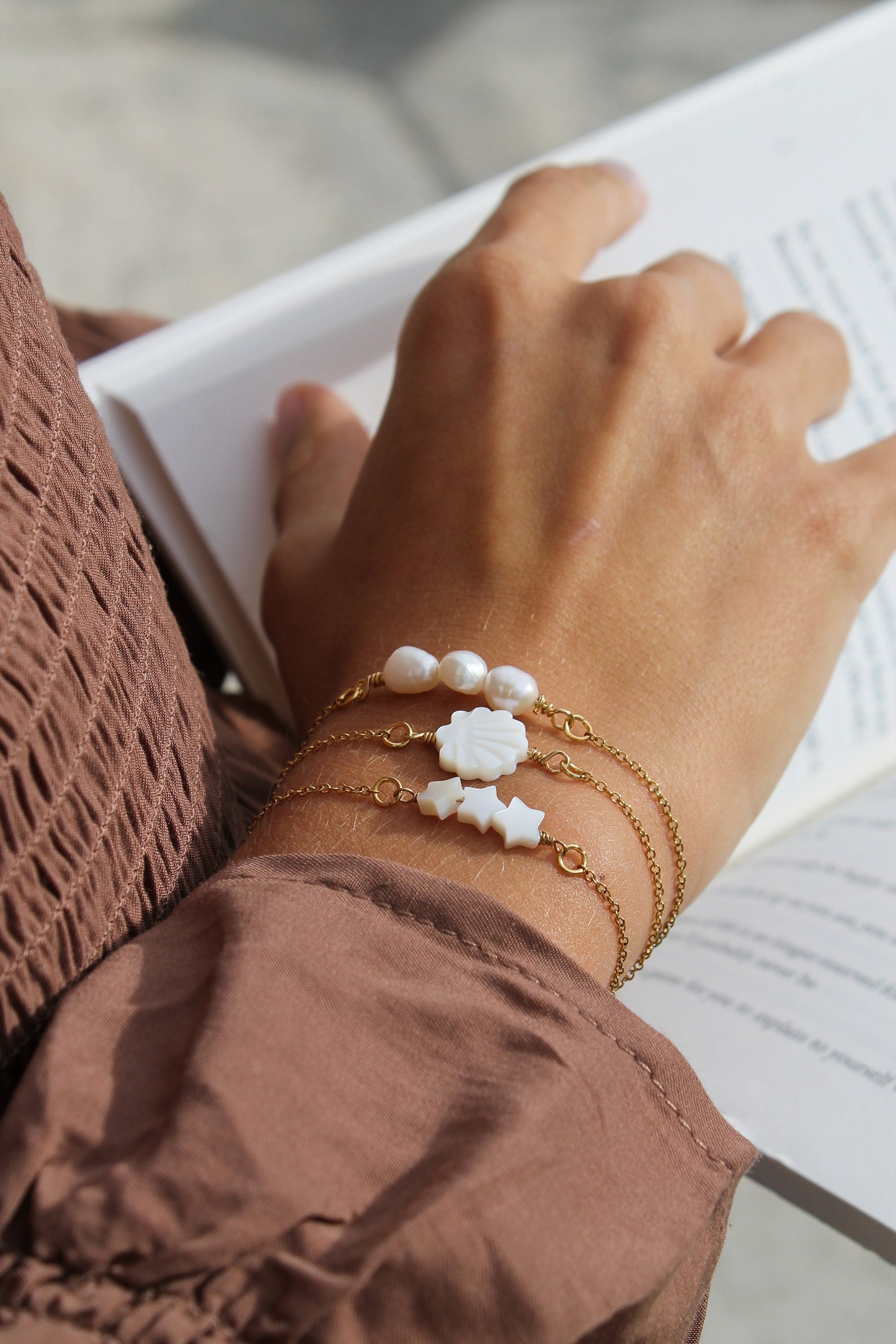 Very delicate and minimal bracelet perfect for layering with other bracelets from our shops.The shell is fragile and need to be cared of. Avoid wearing it during sport or intense activities so it doesn't break.