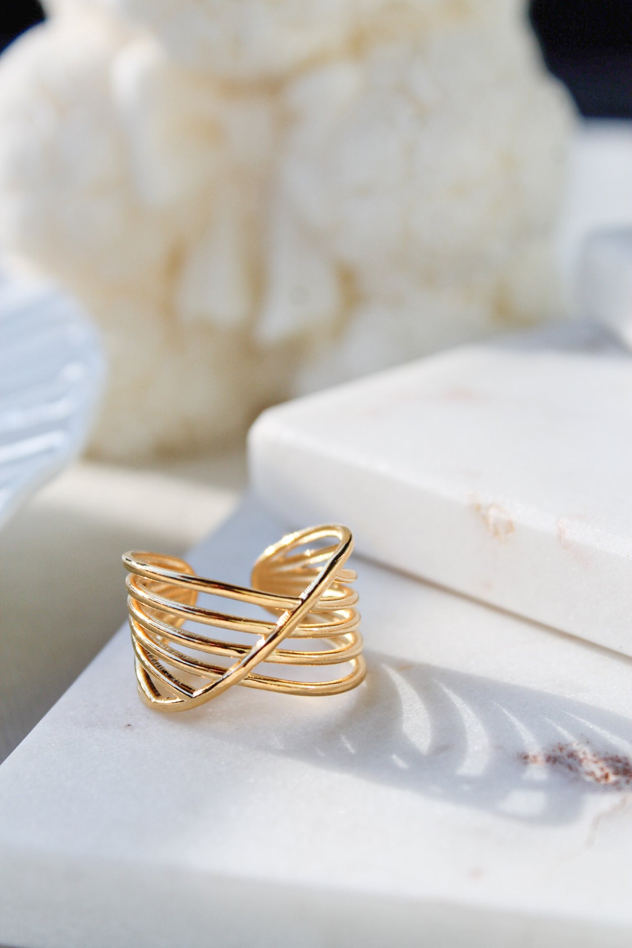 The Nura Ring is a modern statement piece designed to elevate your everyday look. With its architectural shape and open-band silhouette, this bold gold ring offers striking detail without sacrificing comfort.