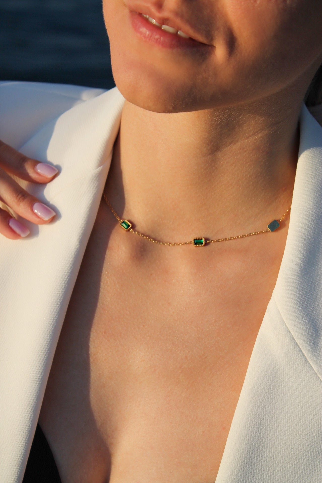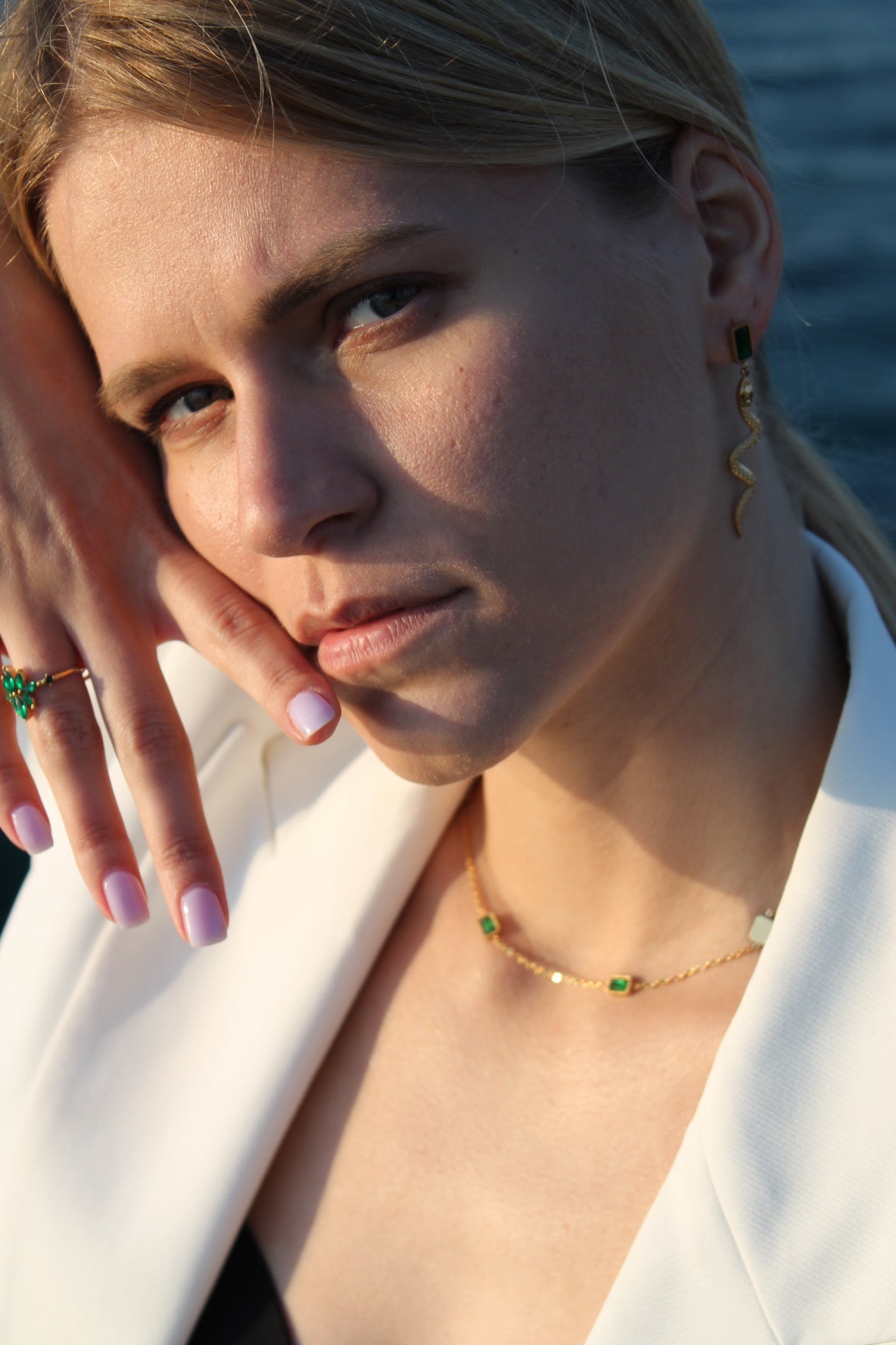 Thin and delicate chain with small rectangle charms. This necklace has been inspired from spring / summer. It’s intense green colour reminds of blooming nature during these seasons.