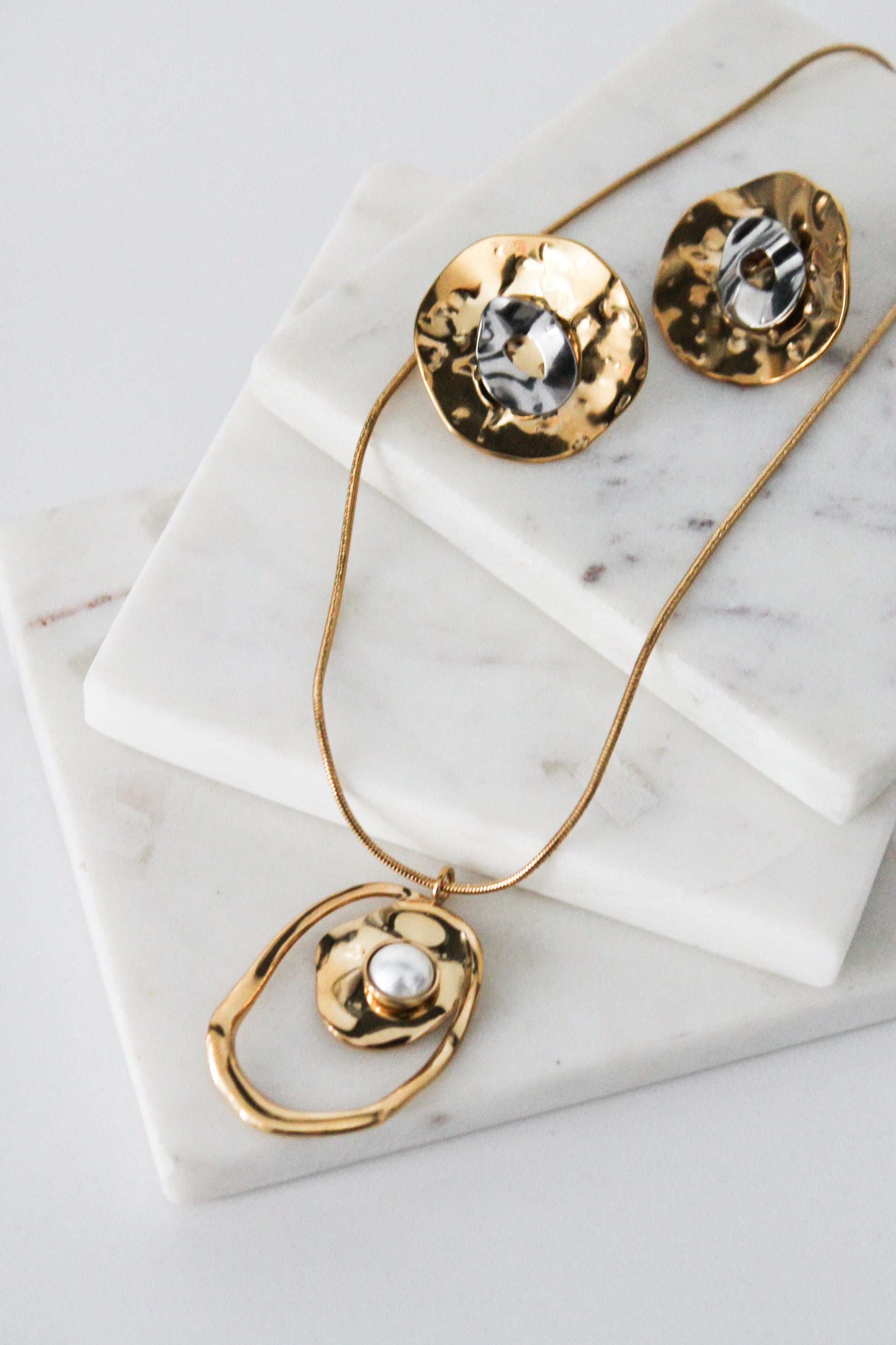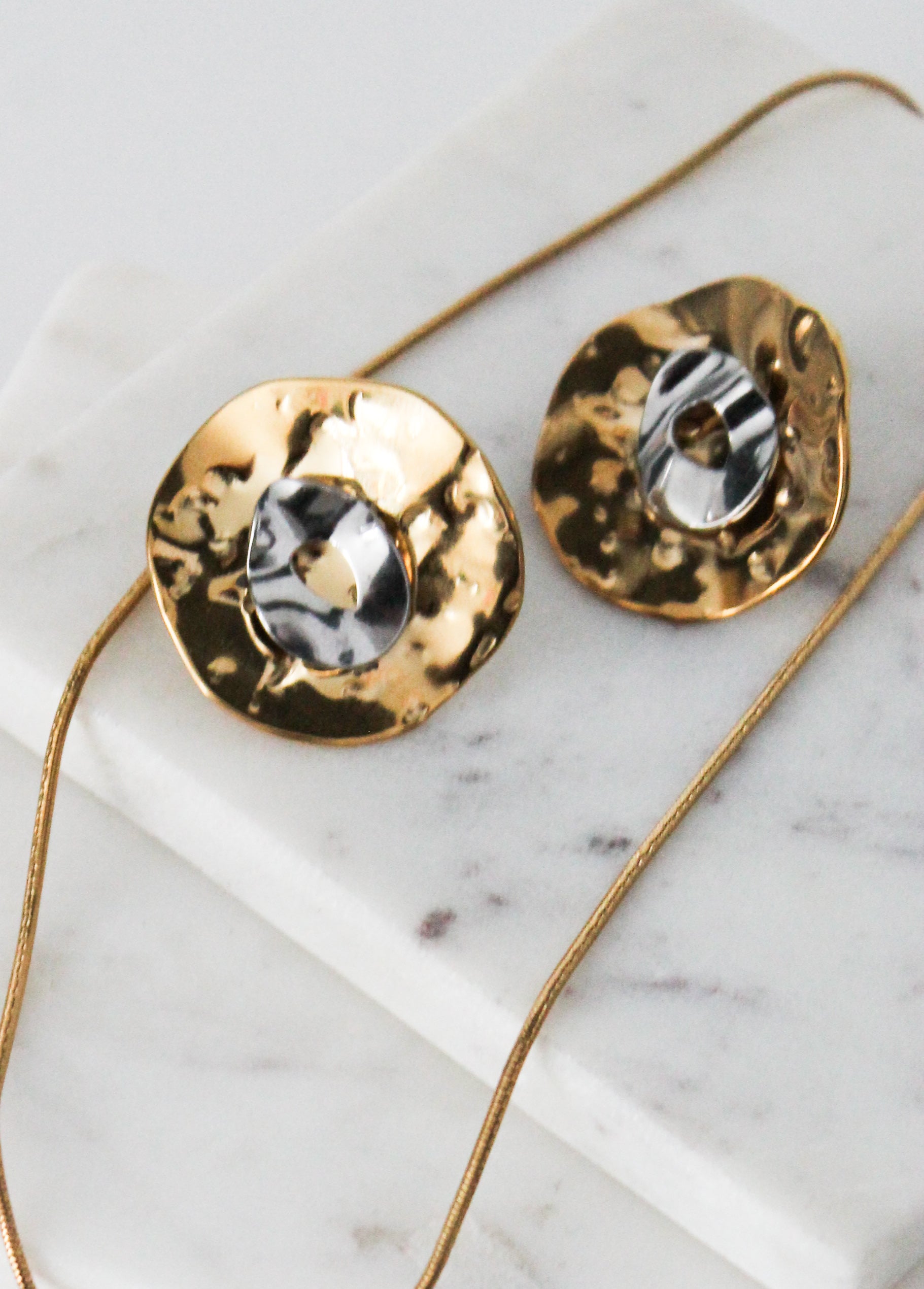 The Subway Static Earrings are for women who thrive in the noise — who turn chaos into style. With an organic, sculpted gold form and a marbled metallic center, these earrings fuse raw texture with urban elegance. The hammered finish reflects the city’s pulse, while the irregular shape keeps things unexpected — like a late-night reroute. Hypoallergenic and feather-light, they're made to make statements without saying a word.Wear them with a sleek bun, a structured blazer, and your attitude. This is your main character moment.
